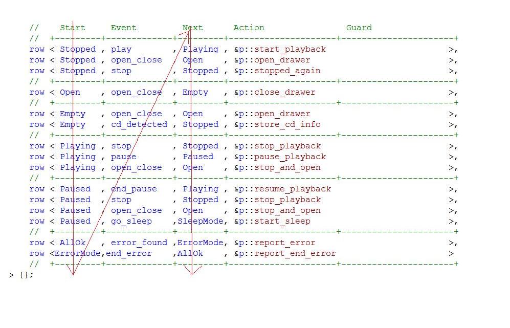 Stopped will get id 0, Open id 1, ErrorMode id 6 and SleepMode (seen only in the “Next” column) id 7. If you have some implicitly created states, like transition-less initial states or states created using the explicit_creation typedef, these will be added as a source at the end of the transition table. If you have submachine states, a row will be added for them at the end of the table, after the automatically or explicitly created states, which can change their id. The next help you will need for debugging would be to call the current_state method of the state_machine class, then the display_type helper to generate a readable name from the id. If you do not want to go through the transition table to fill an array of names, the library provides another helper, fill_state_names, which, given an array of sufficient size (please see next section to know how many states are defined in the state machine), will fill it with typeid-generated names.