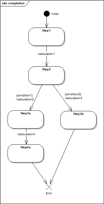 Completion events (or transitions), also called anonymous transitions, are defined as transitions having no defined event triggering them. This means that such transitions will immediately fire when a state being the source of an anonymous transition becomes active, provided that a guard allows it. They are useful in modeling algorithms as an activity diagram would normally do. In the real-time world, they have the advantage of making it easier to estimate how long a periodically executed action will last. For example, consider the following diagram.
