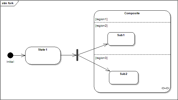 The last entry possibility is using fork. A fork is an explicit entry into one or more regions. Other regions are again activated using their initial state.