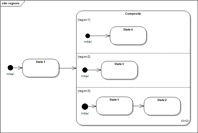 A composite state is a state containing a region or decomposed in two or more regions. A composite state contains its own set of states and regions.