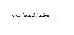 A transition is the switching between active states, triggered by an event. Actions and guard conditions can be attached to the transition. The action executes when the transition fires, the guard is a Boolean operation executed first and which can prevent the transition from firing by returning false.
