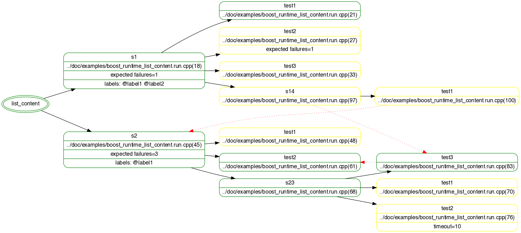 > ./boost_runtime_list_content --list_content s1*: disabled suite 1 test1*: enabled test2 : defaulted test3 : defaulted s14 : test suite which depends on another test suite test1 s2* test1 : defaulted test2*: enabled w. precondition s23* test1 test2 test3* |